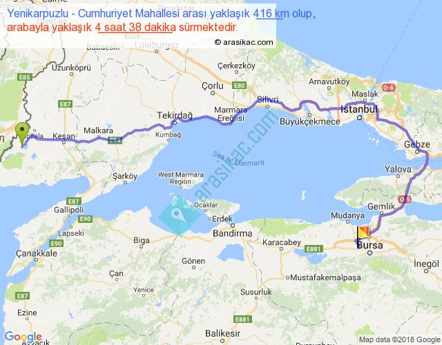 Yenikarpuzlu - Cumhuriyet Mahallesi arası yaklaşık olarak 90 km/h ile yukarıda belirtilen sürede olup, iki yerin kuş uçuşu uzaklığı (mesafesi) 235'dir. Yolculuk otobüsle 6 saat 1 dakika sürmektedir.