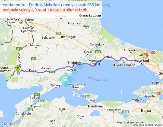 Yenikarpuzlu - Dikilitaş Mahallesi arası yaklaşık olarak 90 km/h ile yukarıda belirtilen sürede olup, iki yerin kuş uçuşu uzaklığı (mesafesi) 227'dir. Yolculuk otobüsle 4 saat 12 dakika sürmektedir.