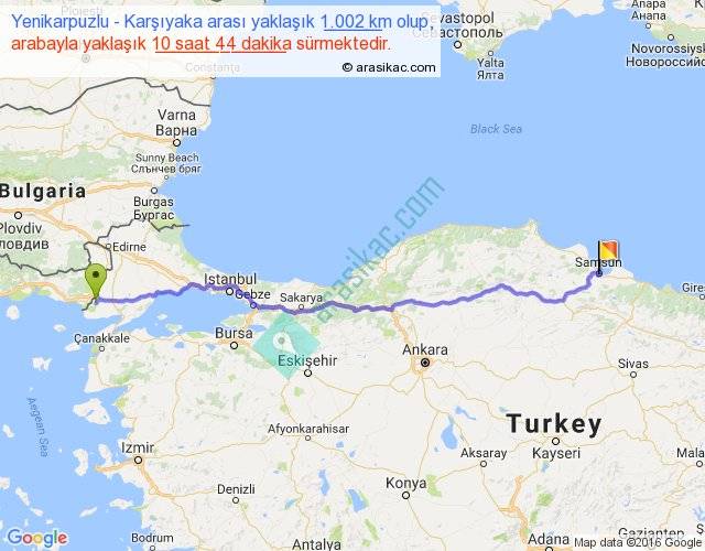 Yenikarpuzlu - Karşıyaka arası yaklaşık olarak 90 km/h ile yukarıda belirtilen sürede olup, iki yerin kuş uçuşu uzaklığı (mesafesi) 840'dir. Eğer belirtilen yerler arasında uçak seferi var ise bu süre uçakla 1 saat 17 dakika'ya kadar düşebilir. Yolculuk otobüsle 13 saat 57 dakika sürmektedir.