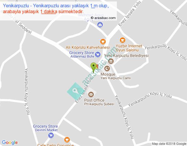 Yenikarpuzlu - Yenikarpuzlu arası yaklaşık olarak 90 km/h ile yukarıda belirtilen sürede olup, iki yerin kuş uçuşu uzaklığı (mesafesi) 0'dir. Yolculuk otobüsle 1 dakika sürmektedir.