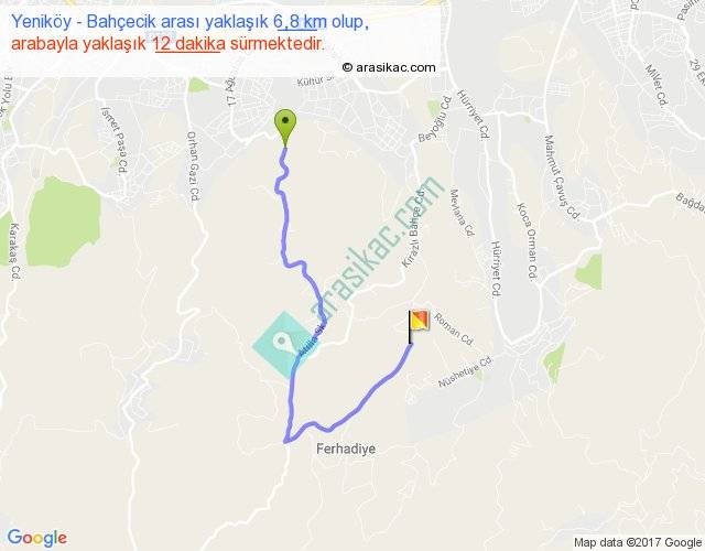 Yeniköy - Bahçecik arası yaklaşık olarak 90 km/h ile yukarıda belirtilen sürede olup, iki yerin kuş uçuşu uzaklığı (mesafesi) 3'dir. Yolculuk otobüsle 15 dakika sürmektedir.