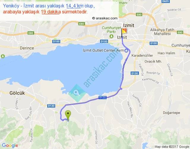 Yeniköy - İzmit arası yaklaşık olarak 90 km/h ile yukarıda belirtilen sürede olup, iki yerin kuş uçuşu uzaklığı (mesafesi) 10'dir. Yolculuk otobüsle 24 dakika sürmektedir.