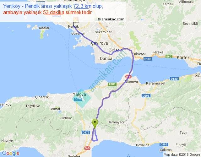 Yeniköy - Pendik arası yaklaşık olarak 90 km/h ile yukarıda belirtilen sürede olup, iki yerin kuş uçuşu uzaklığı (mesafesi) 39'dir. Yolculuk otobüsle 1 saat 8 dakika sürmektedir.
