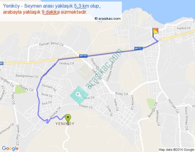 Yeniköy - Seymen arası yaklaşık olarak 90 km/h ile yukarıda belirtilen sürede olup, iki yerin kuş uçuşu uzaklığı (mesafesi) 3'dir. Yolculuk otobüsle 11 dakika sürmektedir.