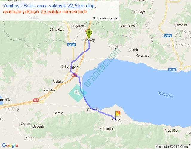 Yeniköy - Sölöz arası yaklaşık olarak 90 km/h ile yukarıda belirtilen sürede olup, iki yerin kuş uçuşu uzaklığı (mesafesi) 16'dir. Yolculuk otobüsle 32 dakika sürmektedir.