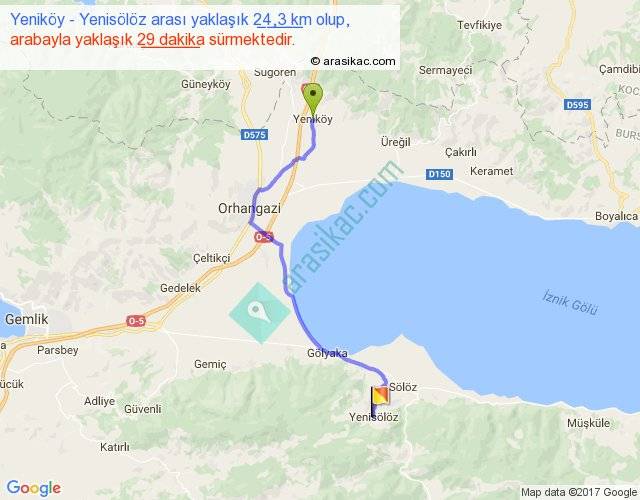 Yeniköy - Yenisölöz arası yaklaşık olarak 90 km/h ile yukarıda belirtilen sürede olup, iki yerin kuş uçuşu uzaklığı (mesafesi) 18'dir. Yolculuk otobüsle 37 dakika sürmektedir.