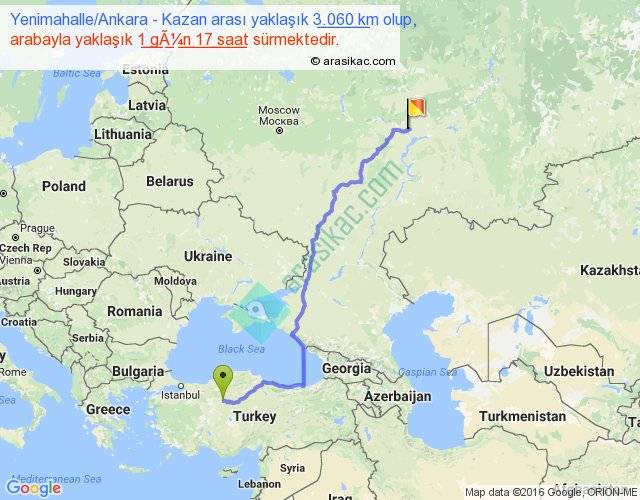 Yenimahalle Ankara - Kazan arası yaklaşık olarak 90 km/h ile yukarıda belirtilen sürede olup, iki yerin kuş uçuşu uzaklığı (mesafesi) 2118'dir. Eğer belirtilen yerler arasında uçak seferi var ise bu süre uçakla 3 saat 15 dakika'ya kadar düşebilir. Yolculuk otobüsle 2 gün 5 saat sürmektedir.