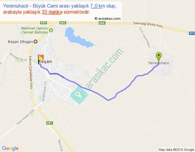 Yenimuhacir - Büyük Cami arası yaklaşık olarak 90 km/h ile yukarıda belirtilen sürede olup, iki yerin kuş uçuşu uzaklığı (mesafesi) 6'dir. Yolculuk otobüsle 26 dakika sürmektedir.