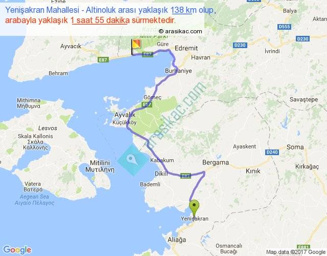Yenişakran Mahallesi - Altinoluk arası yaklaşık olarak 90 km/h ile yukarıda belirtilen sürede olup, iki yerin kuş uçuşu uzaklığı (mesafesi) 80'dir. Yolculuk otobüsle 2 saat 29 dakika sürmektedir.