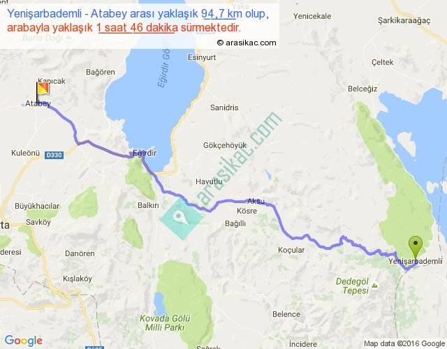 Yenişarbademli - Atabey arası yaklaşık olarak 90 km/h ile yukarıda belirtilen sürede olup, iki yerin kuş uçuşu uzaklığı (mesafesi) 70'dir. Yolculuk otobüsle 2 saat 17 dakika sürmektedir.