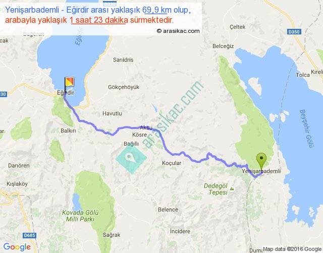 Yenişarbademli - Eğirdir arası yaklaşık olarak 90 km/h ile yukarıda belirtilen sürede olup, iki yerin kuş uçuşu uzaklığı (mesafesi) 50'dir. Yolculuk otobüsle 1 saat 47 dakika sürmektedir.
