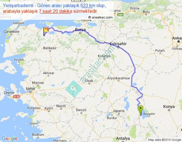 Yenişarbademli - Gönen arası yaklaşık olarak 90 km/h ile yukarıda belirtilen sürede olup, iki yerin kuş uçuşu uzaklığı (mesafesi) 416'dir. Eğer belirtilen yerler arasında uçak seferi var ise bu süre uçakla 38 dakika'ya kadar düşebilir. Yolculuk otobüsle 9 saat 32 dakika sürmektedir.