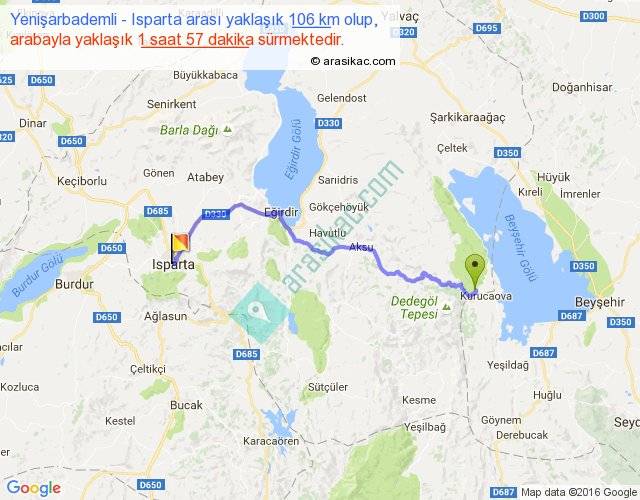 Yenişarbademli - Isparta arası yaklaşık olarak 90 km/h ile yukarıda belirtilen sürede olup, iki yerin kuş uçuşu uzaklığı (mesafesi) 73'dir. Yolculuk otobüsle 2 saat 32 dakika sürmektedir.