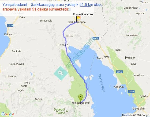 Yenişarbademli - Şarkikaraağaç arası yaklaşık olarak 90 km/h ile yukarıda belirtilen sürede olup, iki yerin kuş uçuşu uzaklığı (mesafesi) 41'dir. Yolculuk otobüsle 1 saat 6 dakika sürmektedir.