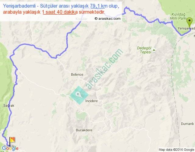 Yenişarbademli - Sütçüler arası yaklaşık olarak 90 km/h ile yukarıda belirtilen sürede olup, iki yerin kuş uçuşu uzaklığı (mesafesi) 42'dir. Yolculuk otobüsle 2 saat 10 dakika sürmektedir.