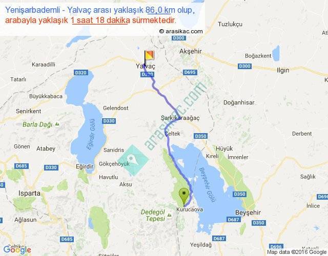 Yenişarbademli - Yalvaç arası yaklaşık olarak 90 km/h ile yukarıda belirtilen sürede olup, iki yerin kuş uçuşu uzaklığı (mesafesi) 68'dir. Yolculuk otobüsle 1 saat 41 dakika sürmektedir.