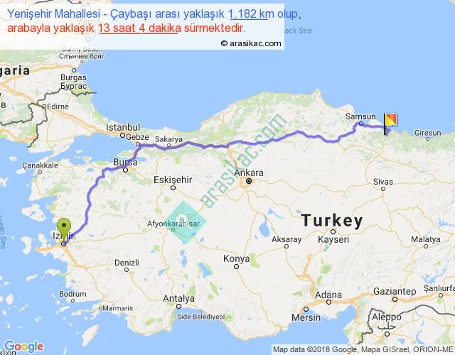 Yenişehir Mahallesi - Çaybaşı arası yaklaşık olarak 90 km/h ile yukarıda belirtilen sürede olup, iki yerin kuş uçuşu uzaklığı (mesafesi) 892'dir. Eğer belirtilen yerler arasında uçak seferi var ise bu süre uçakla 1 saat 22 dakika'ya kadar düşebilir. Yolculuk otobüsle 16 saat 59 dakika sürmektedir.