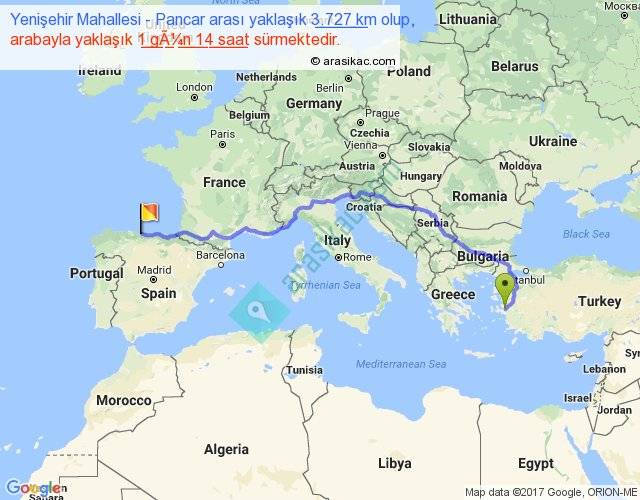 Yenişehir Mahallesi - Pancar arası yaklaşık olarak 90 km/h ile yukarıda belirtilen sürede olup, iki yerin kuş uçuşu uzaklığı (mesafesi) 2706'dir. Eğer belirtilen yerler arasında uçak seferi var ise bu süre uçakla 4 saat 09 dakika'ya kadar düşebilir. Yolculuk otobüsle 2 gün 1 saat sürmektedir.