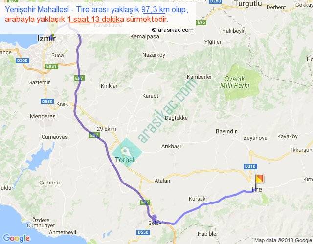 Yenişehir Mahallesi - Tire arası yaklaşık olarak 90 km/h ile yukarıda belirtilen sürede olup, iki yerin kuş uçuşu uzaklığı (mesafesi) 62'dir. Yolculuk otobüsle 1 saat 34 dakika sürmektedir.