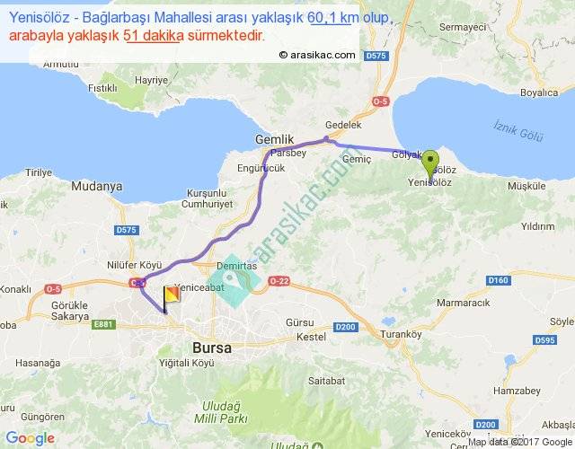 Yenisölöz - Bağlarbaşı Mahallesi arası yaklaşık olarak 90 km/h ile yukarıda belirtilen sürede olup, iki yerin kuş uçuşu uzaklığı (mesafesi) 38'dir. Yolculuk otobüsle 1 saat 6 dakika sürmektedir.