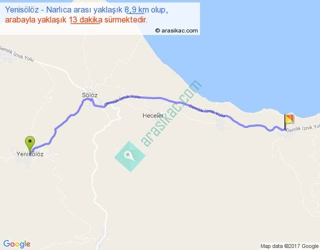 Yenisölöz - Narlıca arası yaklaşık olarak 90 km/h ile yukarıda belirtilen sürede olup, iki yerin kuş uçuşu uzaklığı (mesafesi) 7'dir. Yolculuk otobüsle 16 dakika sürmektedir.