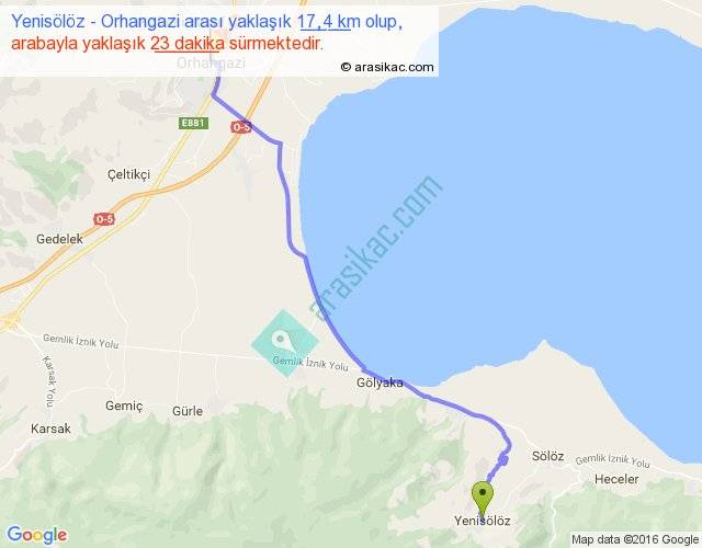Yenisölöz - Orhangazi arası yaklaşık olarak 90 km/h ile yukarıda belirtilen sürede olup, iki yerin kuş uçuşu uzaklığı (mesafesi) 14'dir. Yolculuk otobüsle 29 dakika sürmektedir.