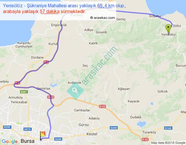 Yenisölöz - Şükraniye Mahallesi arası yaklaşık olarak 90 km/h ile yukarıda belirtilen sürede olup, iki yerin kuş uçuşu uzaklığı (mesafesi) 33'dir. Yolculuk otobüsle 1 saat 14 dakika sürmektedir.