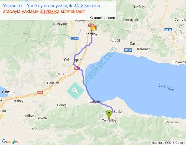 Yenisölöz - Yeniköy arası yaklaşık olarak 90 km/h ile yukarıda belirtilen sürede olup, iki yerin kuş uçuşu uzaklığı (mesafesi) 18'dir. Yolculuk otobüsle 39 dakika sürmektedir.