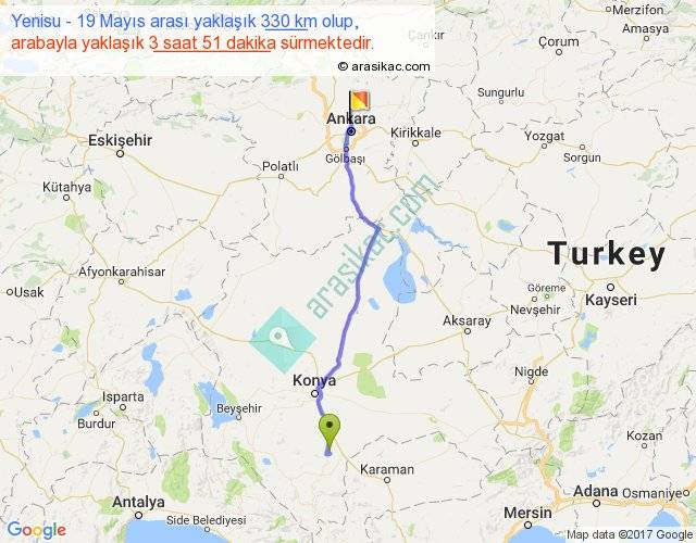 Yenisu - 19 Mayıs arası yaklaşık olarak 90 km/h ile yukarıda belirtilen sürede olup, iki yerin kuş uçuşu uzaklığı (mesafesi) 288'dir. Eğer belirtilen yerler arasında uçak seferi var ise bu süre uçakla 26 dakika'ya kadar düşebilir. Yolculuk otobüsle 5 saat 0 dakika sürmektedir.