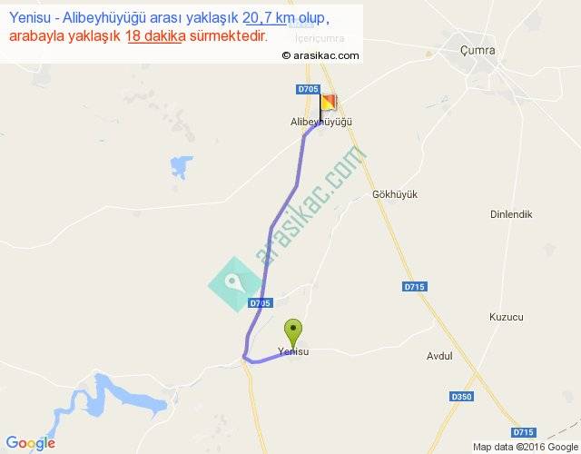 Yenisu - Alibeyhüyüğü arası yaklaşık olarak 90 km/h ile yukarıda belirtilen sürede olup, iki yerin kuş uçuşu uzaklığı (mesafesi) 15'dir. Yolculuk otobüsle 23 dakika sürmektedir.
