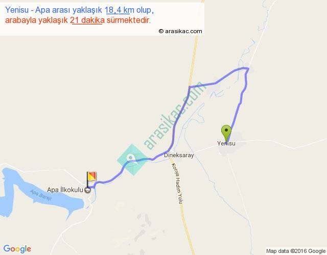 Yenisu - Apa arası yaklaşık olarak 90 km/h ile yukarıda belirtilen sürede olup, iki yerin kuş uçuşu uzaklığı (mesafesi) 9'dir. Yolculuk otobüsle 27 dakika sürmektedir.