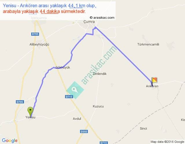 Yenisu - Arıkören arası yaklaşık olarak 90 km/h ile yukarıda belirtilen sürede olup, iki yerin kuş uçuşu uzaklığı (mesafesi) 26'dir. Yolculuk otobüsle 57 dakika sürmektedir.
