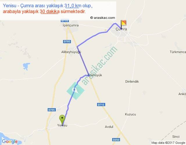 Yenisu - Çumra arası yaklaşık olarak 90 km/h ile yukarıda belirtilen sürede olup, iki yerin kuş uçuşu uzaklığı (mesafesi) 23'dir. Yolculuk otobüsle 39 dakika sürmektedir.