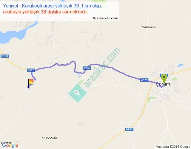 Yeniyol - Karakeçili arası yaklaşık olarak 90 km/h ile yukarıda belirtilen sürede olup, iki yerin kuş uçuşu uzaklığı (mesafesi) 26'dir. Yolculuk otobüsle 50 dakika sürmektedir.