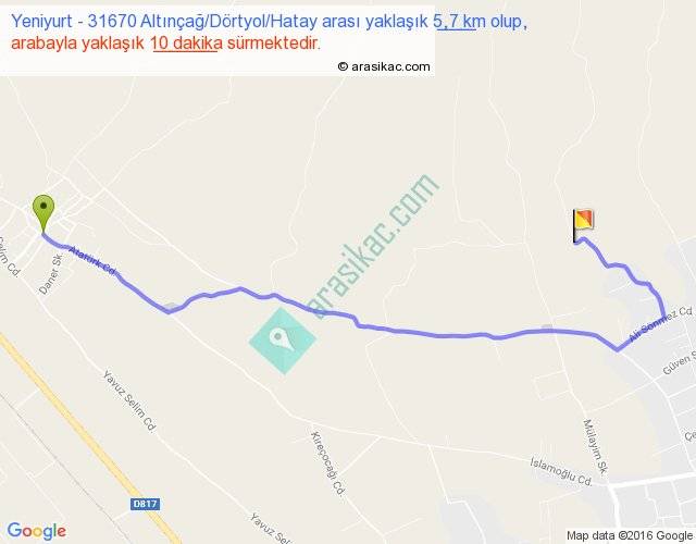 Yeniyurt - 31670 Altınçağ Dörtyol Hatay arası yaklaşık olarak 90 km/h ile yukarıda belirtilen sürede olup, iki yerin kuş uçuşu uzaklığı (mesafesi) 4'dir. Yolculuk otobüsle 13 dakika sürmektedir.