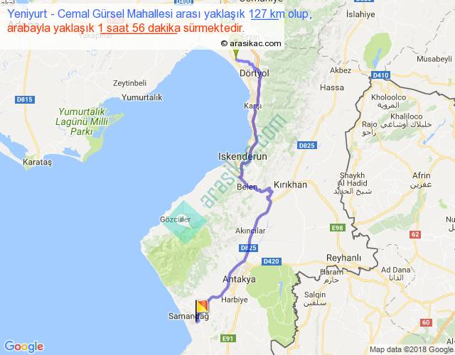 Yeniyurt - Cemal Gürsel Mahallesi arası yaklaşık olarak 90 km/h ile yukarıda belirtilen sürede olup, iki yerin kuş uçuşu uzaklığı (mesafesi) 91'dir. Yolculuk otobüsle 2 saat 30 dakika sürmektedir.