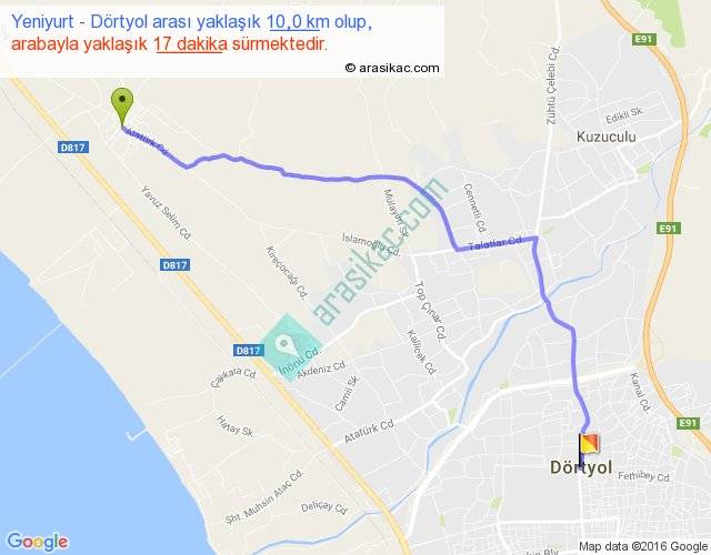 Yeniyurt - Dörtyol arası yaklaşık olarak 90 km/h ile yukarıda belirtilen sürede olup, iki yerin kuş uçuşu uzaklığı (mesafesi) 8'dir. Yolculuk otobüsle 22 dakika sürmektedir.