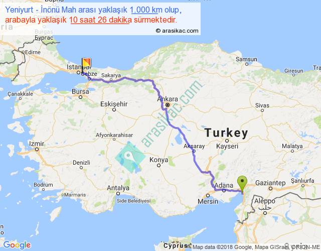 Yeniyurt - İnönü Mah arası yaklaşık olarak 90 km/h ile yukarıda belirtilen sürede olup, iki yerin kuş uçuşu uzaklığı (mesafesi) 752'dir. Eğer belirtilen yerler arasında uçak seferi var ise bu süre uçakla 1 saat 09 dakika'ya kadar düşebilir. Yolculuk otobüsle 13 saat 33 dakika sürmektedir.