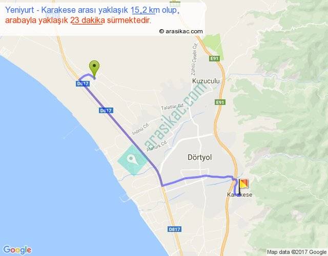 Yeniyurt - Karakese arası yaklaşık olarak 90 km/h ile yukarıda belirtilen sürede olup, iki yerin kuş uçuşu uzaklığı (mesafesi) 11'dir. Yolculuk otobüsle 29 dakika sürmektedir.