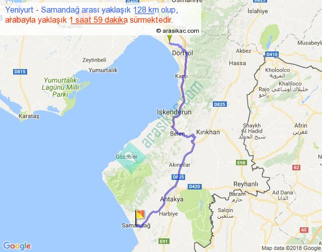 Yeniyurt - Samandağ arası yaklaşık olarak 90 km/h ile yukarıda belirtilen sürede olup, iki yerin kuş uçuşu uzaklığı (mesafesi) 90'dir. Yolculuk otobüsle 2 saat 34 dakika sürmektedir.