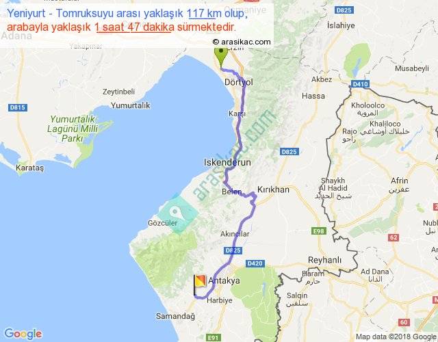 Yeniyurt - Tomruksuyu arası yaklaşık olarak 90 km/h ile yukarıda belirtilen sürede olup, iki yerin kuş uçuşu uzaklığı (mesafesi) 81'dir. Yolculuk otobüsle 2 saat 19 dakika sürmektedir.