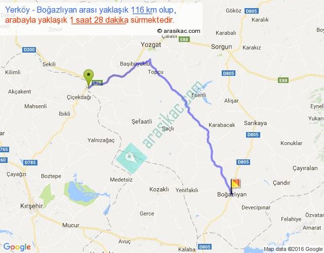 Yerköy - Boğazlıyan arası yaklaşık olarak 90 km/h ile yukarıda belirtilen sürede olup, iki yerin kuş uçuşu uzaklığı (mesafesi) 83'dir. Yolculuk otobüsle 1 saat 54 dakika sürmektedir.