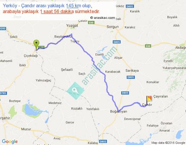 Yerköy - Çandır arası yaklaşık olarak 90 km/h ile yukarıda belirtilen sürede olup, iki yerin kuş uçuşu uzaklığı (mesafesi) 100'dir. Yolculuk otobüsle 2 saat 30 dakika sürmektedir.