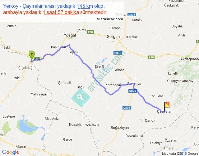 Yerköy - Çayıralan arası yaklaşık olarak 90 km/h ile yukarıda belirtilen sürede olup, iki yerin kuş uçuşu uzaklığı (mesafesi) 107'dir. Yolculuk otobüsle 2 saat 32 dakika sürmektedir.