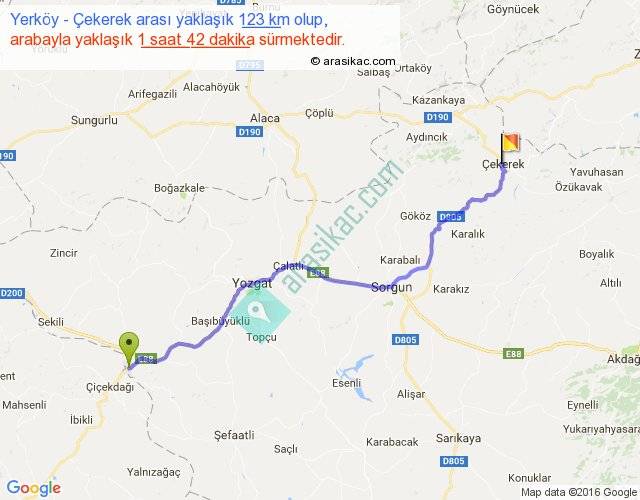Yerköy - Çekerek arası yaklaşık olarak 90 km/h ile yukarıda belirtilen sürede olup, iki yerin kuş uçuşu uzaklığı (mesafesi) 99'dir. Yolculuk otobüsle 2 saat 12 dakika sürmektedir.
