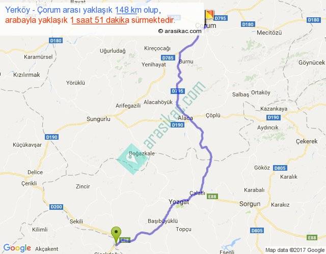 Yerköy - Çorum arası yaklaşık olarak 90 km/h ile yukarıda belirtilen sürede olup, iki yerin kuş uçuşu uzaklığı (mesafesi) 108'dir. Yolculuk otobüsle 2 saat 24 dakika sürmektedir.