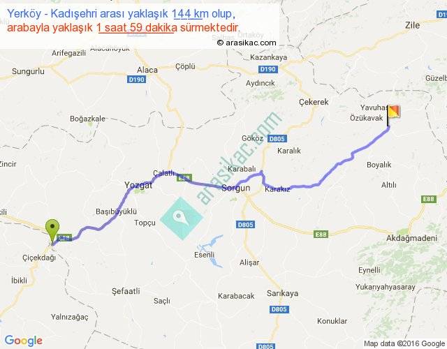 Yerköy - Kadışehri arası yaklaşık olarak 90 km/h ile yukarıda belirtilen sürede olup, iki yerin kuş uçuşu uzaklığı (mesafesi) 119'dir. Yolculuk otobüsle 2 saat 34 dakika sürmektedir.