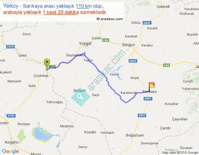 Yerköy - Sarıkaya arası yaklaşık olarak 90 km/h ile yukarıda belirtilen sürede olup, iki yerin kuş uçuşu uzaklığı (mesafesi) 79'dir. Yolculuk otobüsle 1 saat 55 dakika sürmektedir.