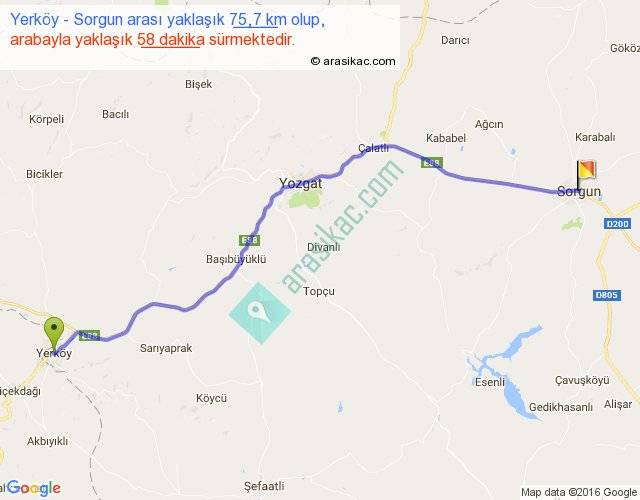 Yerköy - Sorgun arası yaklaşık olarak 90 km/h ile yukarıda belirtilen sürede olup, iki yerin kuş uçuşu uzaklığı (mesafesi) 64'dir. Yolculuk otobüsle 1 saat 15 dakika sürmektedir.