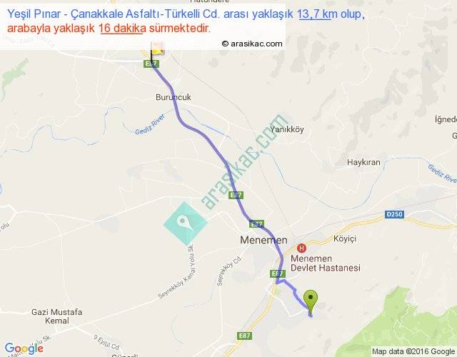 Yeşil Pınar - Çanakkale Asfaltı-Türkelli Cd. arası yaklaşık olarak 90 km/h ile yukarıda belirtilen sürede olup, iki yerin kuş uçuşu uzaklığı (mesafesi) 12'dir. Yolculuk otobüsle 20 dakika sürmektedir.